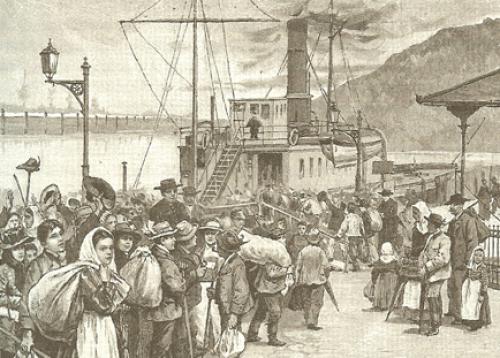 Einschiffung der Hütekinder in Bregenz, aus E. Klein: Tiroler Schwabenkinder in: Gartenlaunbe Nr. 17, 1895