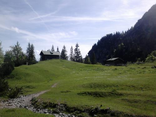 Nach ca. 2 ½ Stunden kann man durchschnaufen und an einer Jagdhütte Rast machen und die Aussicht zum Walchensee hin genießen. Geht man aber noch eine Vietelstunde länger kommt man zu der Pustertal Jagdhütte (eigentlich sind es 2) mit einer schöner Blumenwiese und der Aussicht auf den Anstieg zur Hohen Kiste. Ein kleines Eiland inmitten der Latschen. Und enen Brunnen hat es auch noch. Ab jetzt bis zur Weilheimer Hütte ist das der schönste Wegteil.