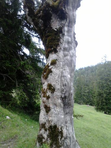 Hier wird es ein wenig kitzlig bzw. unübersichtlich. Durch die Latschen führen viele Wege. Man muss versuchen auf dem breitesten zu bleiben, dann findet man auch die roten Markierungen, die hier aber ziemlich verblasst sind. Wenn sich die Wege wieder einigermaßen vereint haben, trennen sie sich auch schon wieder. Unbedingt rechts halten, sonst kommt man am Möslgratl raus und muss entweder unterhalb der Wand in den Schotterfeldern frei trasieren oder auf dem Weg weiter zum Jagdhaus im oberern Michlfeld gehen.