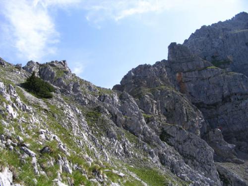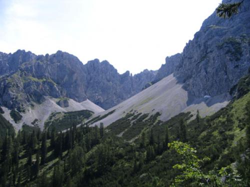 Der historische Fluchtweg geht aber unten auf dem Ochsenbodensteig weiter zur Hochlandalm. Er steigt jetzt weiter rasch um weiter 400 Hm an, bis man plötzlich die Hochlandhütte sieht. Die sie einrahmenden Bäume gab es damals wohl noch nicht. Von der Hochlandhütte hat man eine gute Aussicht auf das Karwendel und ein freies Schußfeld auf den Weg und das zu querende Geröllfeld. Warum die Flüchtenden den meiner Meinung nach gefährlicheren Weg gegangen sind, entzieht sich meiner Kenntnis, wird aber wohl einen Grund gehabt haben. Zum Queren des Geröllfeldes mussten sie sich die Schuhe umwickeln um nicht durch losgetretene Steine auf sich aufmerksam zu machen. Auch der Einstieg in die Felsen ist von der Hochlandhütte gut einsehbar. Schlechtes Wetter und die Dämmerung haben ihnen bis dahin sicherlich geholfen. Heute ist das aber nicht empfehlenswert.