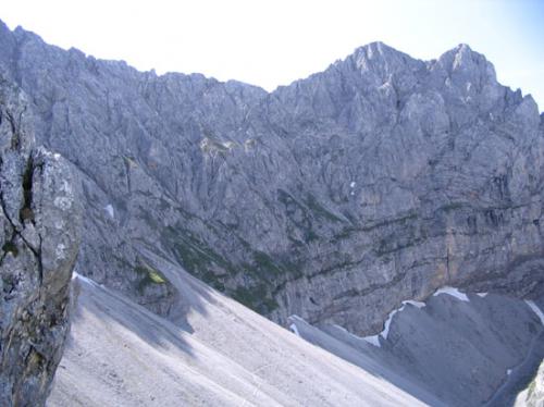 Alternativ kann man ab der Bergwachthütte oberhalb der Dammkarhütte links zum Predigtstuhl aufsteigen (1 Std. ab Dammkarhütte). Ab dem Gipfelkreuz ist alpine Erfahrung gefragt. Absolute Trittsicherheit und Schwindelfreiheit sind erforderlich um den Weg zur Hochlandhütte abzusteigen, den die Flüchtling aufgestiegen sind.